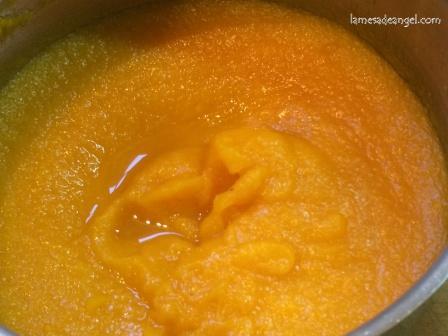 Otra opción es hacerla en el horno. Lo pre-calentamos a 200º. La cortamos por la mitad, quitamos las pepitas y la metemos en una bandeja con la piel hacia abajo 45 m. Dejamos que se enfríe hasta que podamos manejarla y separamos la pulpa de la piel. Hacemos puré con la batidora o el robot de cocina.