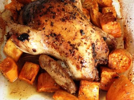 Pelamos la batata o una patata hermosa y la cortamos en trozos grandes. La metemos en un bol resistente al calor con un poquito de aceite, sal pimienta y orégano. Tapamos con un film, hacemos unos agujeritos y lo metemos en el microondas a máxima potencia 8 minutos. Cuidado al quitar el film con el vapor. La incorporamos antes de que se termine de hacer el picantón. Si es necesario ponemos un poco el grill al final para que se dore.