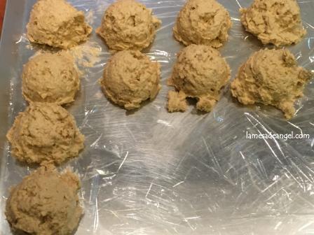 Metemos la masa en la nevera al menos 10 minutos ya que las galletas suben mejor si está bien fría. Con dos cucharitas hacemos bolas de masa y las disponemos en una bandeja preferiblemente antiadherente (yo utilizo un silpat) o si no engrasada o con papel de horno. Deben quedar separadas por lo menos 6 centímetros entre ellas, por lo que se deben hacer entre 2 o 3 hornadas. Conviene guardar la masa en la nevera para que no pierda frío. Hornear de 10 a 12 minutos o hasta que se doren ligeramente los bordes y dejar templar 5 minutos en la bandeja antes de enfriar sobre una rejilla.