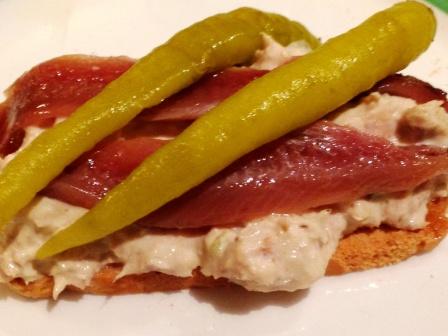 Servimos con la ensalada sobre un panecillo tostado, una anchoa en aceite y una o dos piparras.