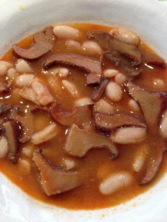 A la hora y media descartamos el ajo y pasamos por la batidora la cebolla. La incorporamos y algo espesará el caldo si es necesario batimos también la patata para que quede un caldo trabado. Incorporamos los níscalos y la pastilla y cocemos otra media hora o hasta que las judías estén tiernas. Jugamos con la tapa según nos guste más o menos caldoso. Rectificamos de sal al final.
