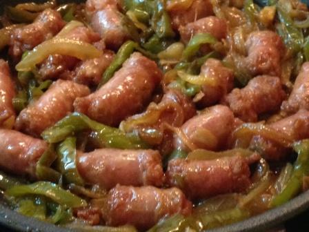 Cortamos las salchichas en cuatro y las doramos en una sartén con aceite bien caliente. Las sacamos de la sartén y reservamos. Bajamos el fuego y pochamos el ajo laminado, la cebolla y el pimiento cortados en juliana y salpimentamos. Cuando empiecen a dorar incorporamos las salchichas y el vino. Dejamos que reduzca lentamente y que evapore la mayoría del líquido.
