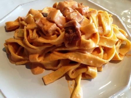 Quitamos la corteza del bacón y lo cortamos en lardones. Lo doramos en una sartén con un poco de aceite y lo reservamos. Podemos retirar la grasa y añadir aceite o utilizarla por su sabor ahumado. Ponemos a dorar el ajo y la cebolla finamente picados. Cuando empiecen a dorar añadimos el vodka y dejamos que evapore el alcohol. A continuación el tomate triturado y removemos.