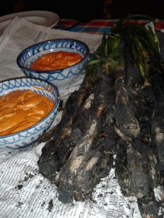 Encendemos fuego en una barbacoa y cuando coja temperatura disponemos los calçots en la rejilla. No hace falta esperar a que esté el carbón blanco y pierda la llama. Cuando empiecen a quemarse (o ya un poco quemados) les damos la vuelta. Sabemos que están hechos cuando al cogerlos por el centro se doblan. Los envolvemos por tandas en papel de periódico y los vamos reservando. Cuando estén todos hechos servimos con la salsa en cuencos. Pelamos el exterior quemado y mojamos el interior en la salsa. Podemos comernos sólo lo blanco o algo más dependiendo del gusto.