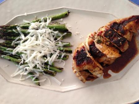 Para servir cortamos el pollo una vez reposado para que no se nos salgan los jugos y salseamos por encima. Acompañan muy bien unos espárragos a la plancha con el mismo queso rallado por encima.