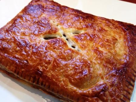 Distribuimos la mezcla sobre el hojaldre sin llegar a los bordes. Dejamos como un par de centímetros. Pintamos todo el borde con huevo y tapamos con la otra mitad del hojaldre. Podemos decorar los extremos como más nos guste o simplemente presionar un poco alrededor con un tenedor. Hacemos una cruz con un cuchillo bien afilado en el centro para que salga el vapor y pintamos ligeramente con huevo para que quede brillante.