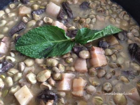 Cocemos de 20 a 30 minutos a fuego medio bajo o hasta que las habas estén tiernas. Jugamos con la tapa porque no deben quedar secas, pero tampoco es un plato caldoso. Rectificamos de sal al final porque el tocino ha podido aportar sal. Cuando esté terminado añadimos el foie cortado en dados por encima para que se temple o decora con unas hojas de menta.