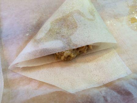 Cortamos la pasta brick en tiras de unos 10 centímetros Ponemos una cucharadita del relleno y vamos doblando en triángulos. Cuando lleguemos al final lo remetemos por el último doblez. Pintamos los sobres con mantequilla derretida y los metemos al horno en una placa sobre papel de horno hasta que estén dorados.