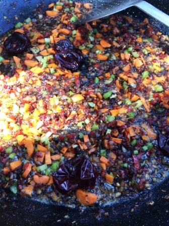 Lo retiramos y sofreímos la cebolla, el puerro y los pimientos añadiendo sal para que pochen antes. Incorporamos la zanahoria, el apio y la ñora y damos unas vueltas con cuidado de que no se queme. Añadimos el vino blanco de la maceración para desglasar el fondo y una vez evaporado el alcohol incorporamos el tomate. Al final añadimos más especias si nos gusta y reducimos el tomate.