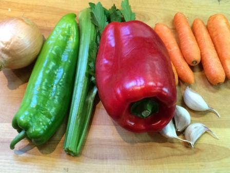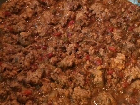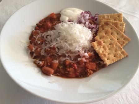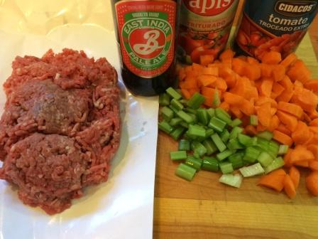 En una cazuela grande pochamos la cebolla, los pimientos y el ajo picados, salpimentando. Incorporamos la carne picada, no deshaciéndola del todo para que luego quede algún trocito más o menos entero. Añadimos las especias. Doramos un poco e incorporamos la cerveza. Cuando reduzca añadimos el tomate triturado y el tomate troceado con su caldo. Volvemos a reducir un poco y por último añadimos el apio y la zanahoria picado en dados y el bote de alubias sin caldo. Si hace falta añadimos un poco de agua y dejamos cocer lentamente 25 minutos removiendo con cuidado cada poco tiempo. Rectificamos de sal y si hace falta de azúcar si el tomate era muy acido.
