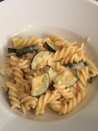 Lavamos el calabacín y lo pelamos en tiras para que al cortarlo quede más bonito o lo dejamos sin pelar, al gusto. Lo cortamos en cuatro a lo largo y cortamos en rodajitas como de 3 o 4 milímetros. En una sartén ponemos a dorar el ajo finamente picado. Antes de que coja color agregamos el calabacín a la sartén, salpimentamos y le damos unas vueltas. No lo hacemos demasiado porque al final debe quedar un poco entero. Incorporamos el vino blanco, dejamos que evapore y a continuación la nata ya con el fuego bajo para que no hierva mucho y se corte la nata. Añadimos la pasta ya hervida sin necesidad de escurrir mucho y dejamos que reduzca un poco. Por último y ya fuera del fuego incorporamos el queso Gorgonzola cortado en dados. No hace falta que se disuelva del todo. Si vemos que queda muy espeso podemos diluir con un poco del agua de la cocción de la pasta. Ojo con la sal que el queso es salado. Servimos con queso rallado y pimienta negra recién molida al gusto.