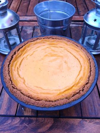 Hornear en el centro del horno a 170º durante 45 minutos o hasta que al pinchar con un palillo a unos 3 centímetros del borde salga seco. El centro debe de moverse un poco. Dejar templar unos minutos en el molde. Desmoldar y dejar reposar en la nevera hasta que se siente.