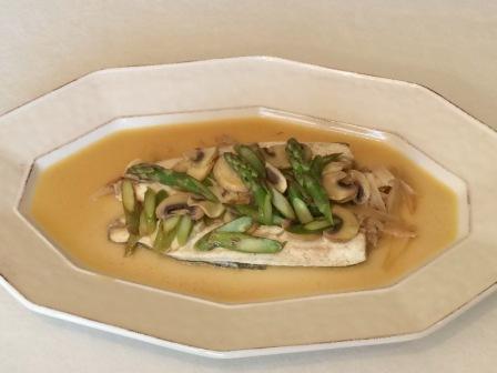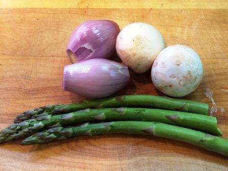 Pochamos en una sartén las chalotas cortadas en juliana con un poco de sal para que se agachen antes y las ponemos en el papel. Encima ponemos los dos lomos de lubina bien lavada con la piel hacia abajo y salpimentamos. Tronchamos los espárragos para quitar la parte dura y los cortamos en rodajitas al bies dejando las yemas enteras. Los salteamos dos minutos en la sartén con un poquito de aceite. Incorporamos los champiñones laminados y salteamos otros dos minutos. Los ponemos encima de la lubina decorando con las yemas y regamos con el vino.