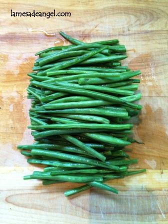 Quitamos los extremos de las judías finas, las lavamos y cortamos por la mitad o en tres si son muy largas. Las escaldamos 5 minutos en agua con sal y las enfriamos rápidamente para que no pierdan color.