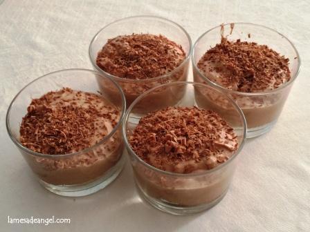 Con el robot de cocina hacemos polvo de galleta. También podemos meterlas en una bolsa y machacarla con un rodillo o una botella. Repartimos el polvo en 6 vasos y encima distribuimos el relleno dándole golpecitos en la base para que se reparta bien. Guardamos en la nevera al menos 3 horas o hasta el día siguiente. Sacar de la nevera 15 minutos antes de servir y espolvorear con ralladura de chocolate.