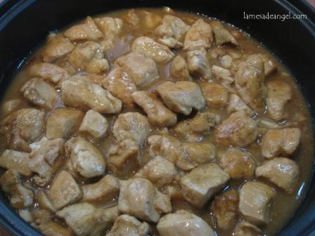 Cortamos en trocitos grandes los ajos y los doramos en una cacerola baja con aceite, un poco de sal y la cayena. Los retiramos. Cortamos en dados (calculando que sean como de un bocado para no necesitar ni cuchillo) las pechugas de pollo y las salpimentamos. Las doramos brevemente en la misma cacerola añadiendo un poco aceite si es necesario. Conviene hacerlo en dos tandas, porque si no se cuece más que dorarse. Reincorporamos los ajos y añadimos la cucharita de harina al aceite para que se dore un pelín, pero con cuidado de que no se queme.