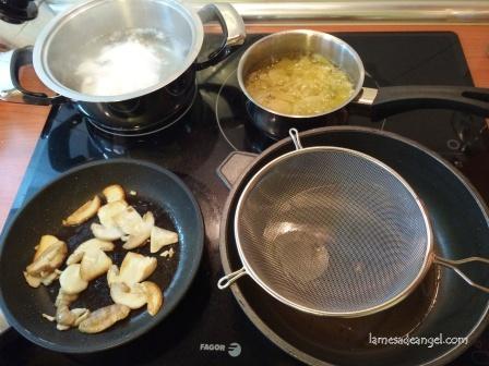 A la vez limpiamos el boleto de tierra con un cepillo y si es necesario lo pelamos, pero nunca lo metemos en agua. Lo cortamos en laminas. Lo salteamos en la sartén con un poco de sal. Soltará agua y cuando la vuelva a coger está listo.