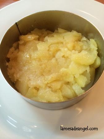 Servimos con un molde circular las patatas con los boletos encima y por último el huevo con sal en escamas y un poco de pimienta recién molida.