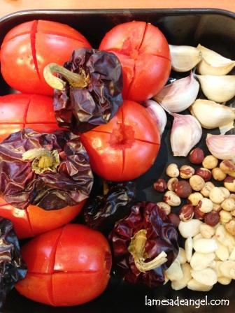 En una fuente de horno disponemos todos los ingredientes enteros y sin pelar excepto el pan. A los tomates les quitamos el pedúnculo y les damos un corte en cruz por arriba para que no revienten. Lo metemos en el horno y vigilamos con atención. Por otro lado freímos el pan en aceite. Vamos retirando los ingredientes según se vayan tostando. Lo primero serán las ñoras en tres o cuatro minutos que se queman con mucha facilidad. Luego los frutos secos, después los ajos y por último los tomates. Guardamos el líquido sobrante. Ponemos todo en la batidora y batimos bien. Aliñamos con sal, pimienta, aceite (abundante, como medio vaso de agua) y vinagre. Tiene que quedar espesa y untuosa pero que se noten los trocitos de frutos secos. Si es necesario agregamos líquido de la fuente de horno y probamos metiendo una cucharilla y comprobando que se impregna bien. Metemos en la nevera cuando se enfríe y dejamos reposar preferiblemente hasta el día siguiente.