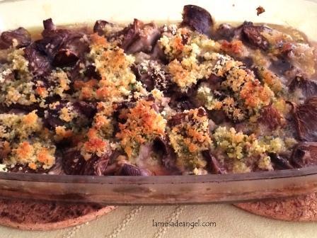 En una fuente de horno disponemos el solomillo. Cubrimos con las setas limpias con un cepillo y cortadas si son muy grandes en trozos de un bocado y las salpimentamos. A continuación tapamos todo con las migas de pan y metemos al horno 15 minutos. Si vemos que no se dora el pan podemos poner un poco el grill. Esta seta suelta bastante agua.