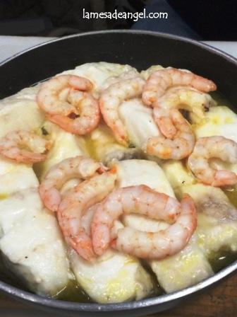 En una sartén con aceite ponemos a pochar el ajo, la cebolla y el perejil cortados finamente y la cayena desmenuzada. Cuando se ponga trasparente añadimos el vino blanco. Dejamos que se evapore el alcohol e incorporamos los lomos con la piel hacia abajo. Salpimentamos cocemos tapado alrededor de 4 minutos dependiendo del grosor. Añadimos por encima las gambas peladas con un poco de sal y reposamos tapado otros cinco minutos. Servimos directamente en la sartén.