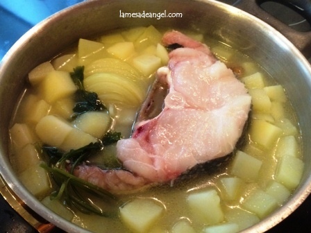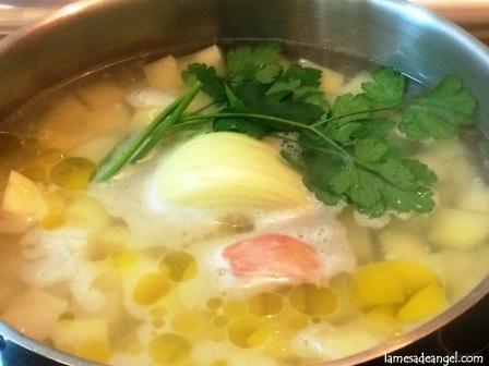 En un cazo ponemos a cocer la cebolleta, el ajo con un golpe y el perejil con un chorrito de aceite cuando rompa a hervir añadimos la patata cortada en daditos y salamos. Hervimos a fuego suave y tapado 20 minutos con agua suficiente para que cubra. Añadimos el pescado salpimentado haciéndole hueco entre las patatas. Cocemos tapado 5 minutos. Retiramos del fuego y reposamos 2 minutos antes de servir. Emplatamos con el caldo o sin él y con un poco de mahonesa casera.