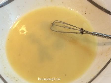 En un bol mezclamos con una varilla el zumo de limón con la sal, la pimienta, la ralladura de limón y una cucharita (o al gusto) de mostaza. Incorporamos poco a poco el aceite para que ligue.