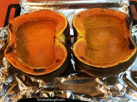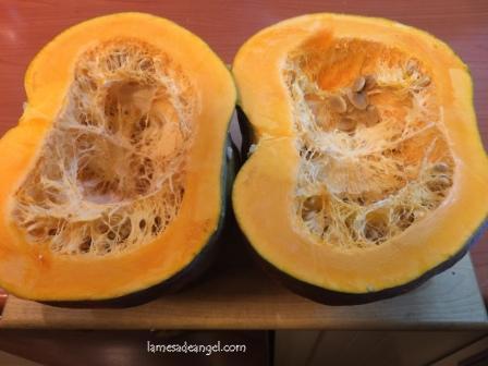 Cortamos la calabaza por la mitad y con una cuchara quitamos las pepitas y hebras que pueda tener. Metemos en una bandeja al horno con la piel hacia abajo 50 minutos o hasta que esté blanda. Retiramos el liquido que haya podido soltar y lo reservamos por si nos hace falta. Dejamos templar y retiramos la piel con las manos antes de que se enfríe del todo. Preparamos al gusto.