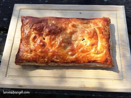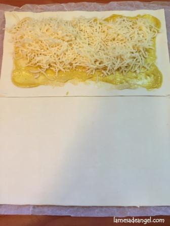 En una sartén pequeña doramos el bacón para que pierda la grasa. Lo escurrimos bien y reservamos. Desenrollamos la masa sobre la encimera sin retirar el papel o si es congelada lo hacemos con un poco de harina para que no se nos pegue. Se corta por la mitad y una de ellas la ponemos sobre papel vegetal en una placa de horno. Distribuimos la mostaza con una cucharita y a continuación distribuimos el queso sin llegar a los bordes. Ponemos por encima el bacón y molemos encima pimienta y nuez moscada al gusto. Humedecemos con huevo batido todo el borde y ponemos la otra mitad de hojaldre un poco estirado para que nos llegue hasta los laterales. Apretamos los bordes para que se peguen. Pintamos con huevo por encima y con la punta del cuchillo hacemos unos agujeritos por encima para que no reviente con el vapor. Metemos en el horno 20 minutos o hasta que esté dorado. Sacamos del horno y a los 5 minutos retiramos a una rejilla para terminar de templar.