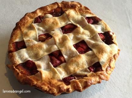 Extender una masa y cubrir un molde de 23 cm. Pinchar con un tenedor y guardar en la nevera. Extender la otra masa y cortar 6 tiras de 3 o 4 centímetros. Incorporar los ingredientes secos a las fresas y mover bien. Añadir al molde con la masa y cubrir con las tiras de masa para hacer una rejilla. Para ello primero hacer una cruz y luego entrelazar. Cerrar los bordes presionando con los dedos y pintar con el huevo batido la masa. Hornear de 30 a 35 minutos o hasta que la masa esté dorada. Dejar enfriar antes de servir.