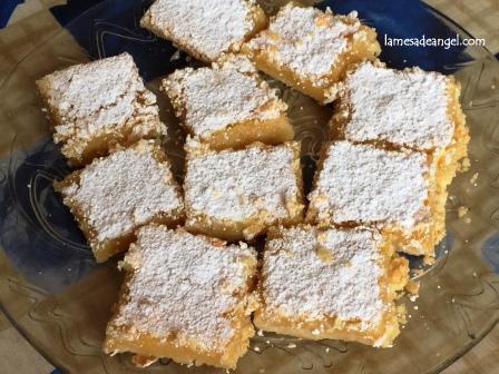 En un bol rallar uno de los limones y agregar el zumo de limón donde disolveremos la harina. Incorporar los huevos y el azúcar y batir con varillas hasta que se disuelva el azúcar. Por último incorporar la levadura y la sal y verter todo sobre la masa. Hornear 25 minutos y retirar sobre una rejilla. A los cinco minutos espolvorear por encima azúcar glas y dejar enfriar completamente antes de desmoldar separando con un cuchillo de los laterales y tirando del papel de horno. Cortar en cuadrados o rectángulos.