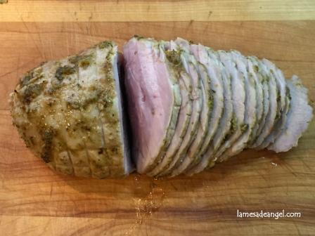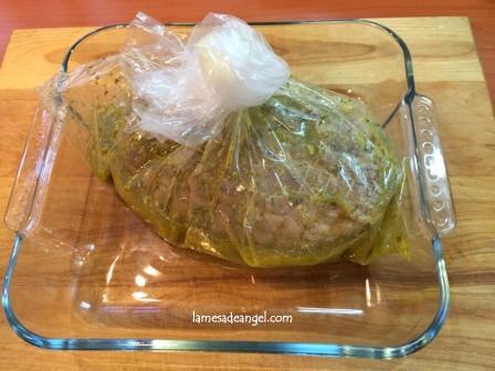 Sacamos la carne de la nevera una hora antes de asarla. Precalentamos el horno a 220º y metemos la carne en un recipiente con un poco de aceite en el fondo en la parte de abajo. A los 15 minutos bajamos el horno a 180º, damos la vuelta a la carne y regamos con un poco de marinada. Horneamos otros 30 minutos regando cada 15. Volvemos a subir el horno a 220º y dejamos 15 minutos para que dore. Sacamos del horno y dejamos enfriar. Para cortarla es mejor que esté templada o incluso fría.