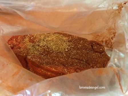El día anterior metemos en una bolsa de plástico las especias de la marinada con la mostaza y el coriandro machacados con el mortero. Metemos la chuleta y la movemos hasta que se impregne bien. Cerramos la bolsa y reposamos en la nevera. Al día siguiente ponemos a calentar un poco de aceite en la olla rápida. Sellamos la carne y antes de que se nos queme el pimentón cubrimos con la cerveza. Añadimos más agua si es necesario hasta que justo cubra la chuleta. Cerramos la olla y cocinamos a fuego bajo 40 minutos. Cuando baje el peso abrimos la olla y sacamos la carne a una fuente para que temple. Desgrasamos bien el caldo y lo ponemos a reducir hasta que pierda casi todo el liquido. Cuando temple la carne la deshuesamos y deshacemos en trozos con las manos descartando toda la grasa. La volvemos a calentar con la reducción del caldo.