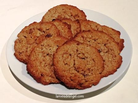 Con una cuchara o un sacabolas de helado hacemos bolas de masa y las disponemos en una bandeja con papel de hornear. Deben quedar separadas por lo menos 5 centímetros entre ellas, por lo que se deben hacer entre 2 o 3 hornadas. Si el horno tiene aire se pueden hacer en varias bandejas a la vez bajando la temperatura 10º. Conviene guardar la masa en la nevera para que no pierda frío entre hornadas. Hornear de 13 a 15 minutos o hasta que se doren ligeramente los bordes y dejar enfriar 5 minutos. Terminar de enfriar sobre una rejilla. Hay que tener cuidado y manejarlas con una espátula porque salen muy blandas. Entre hornada y hornada enfriar la bandeja del horno.