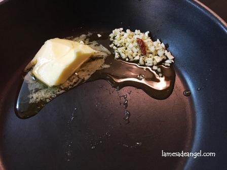 En una sartén disolvemos la mantequilla con el aceite añadimos los ajos bien picados con la cayena entera si no queremos que pique mucho o molida. Damos unas vueltas con cuidado de que no se queme el ajo. Incorporamos la pasta y movemos bien hasta que todo esté bien mezclado. Servimos con queso parmesano y pimienta negra recién molida