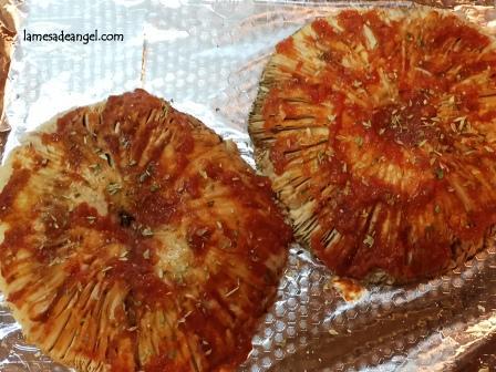 Una forma distinta de comer los parasoles: utilizarlos como base de pizza, y encima te quitas le masa que engorda más. Lo malo es que no suelen venderlos en las tiendas y eso que este año ha sido muy bueno. El truco para distinguirlas de las malas es que el anillo deslice por el pie. Y como siempre si dudas consulta o no la cojas. A disfrutar