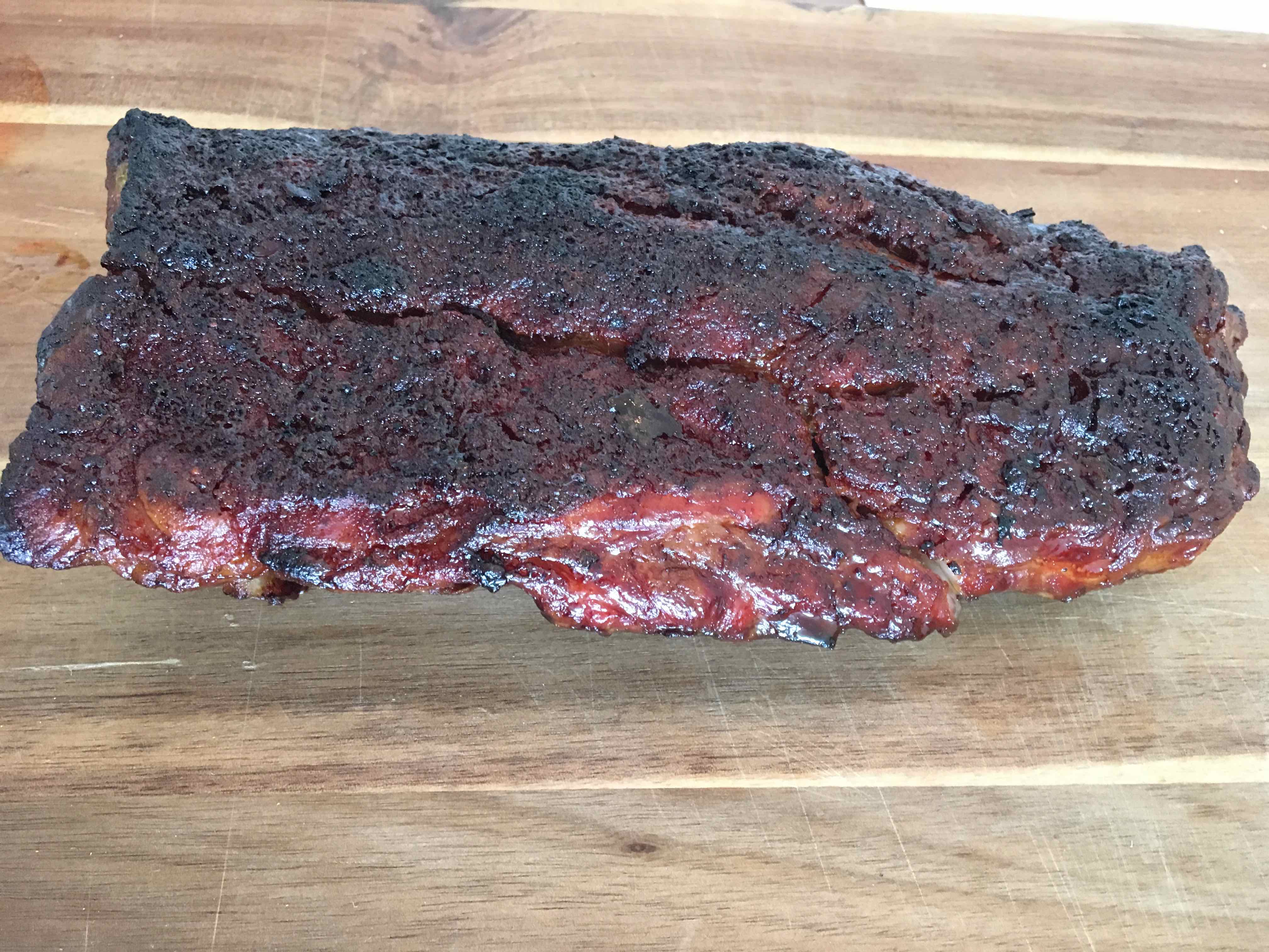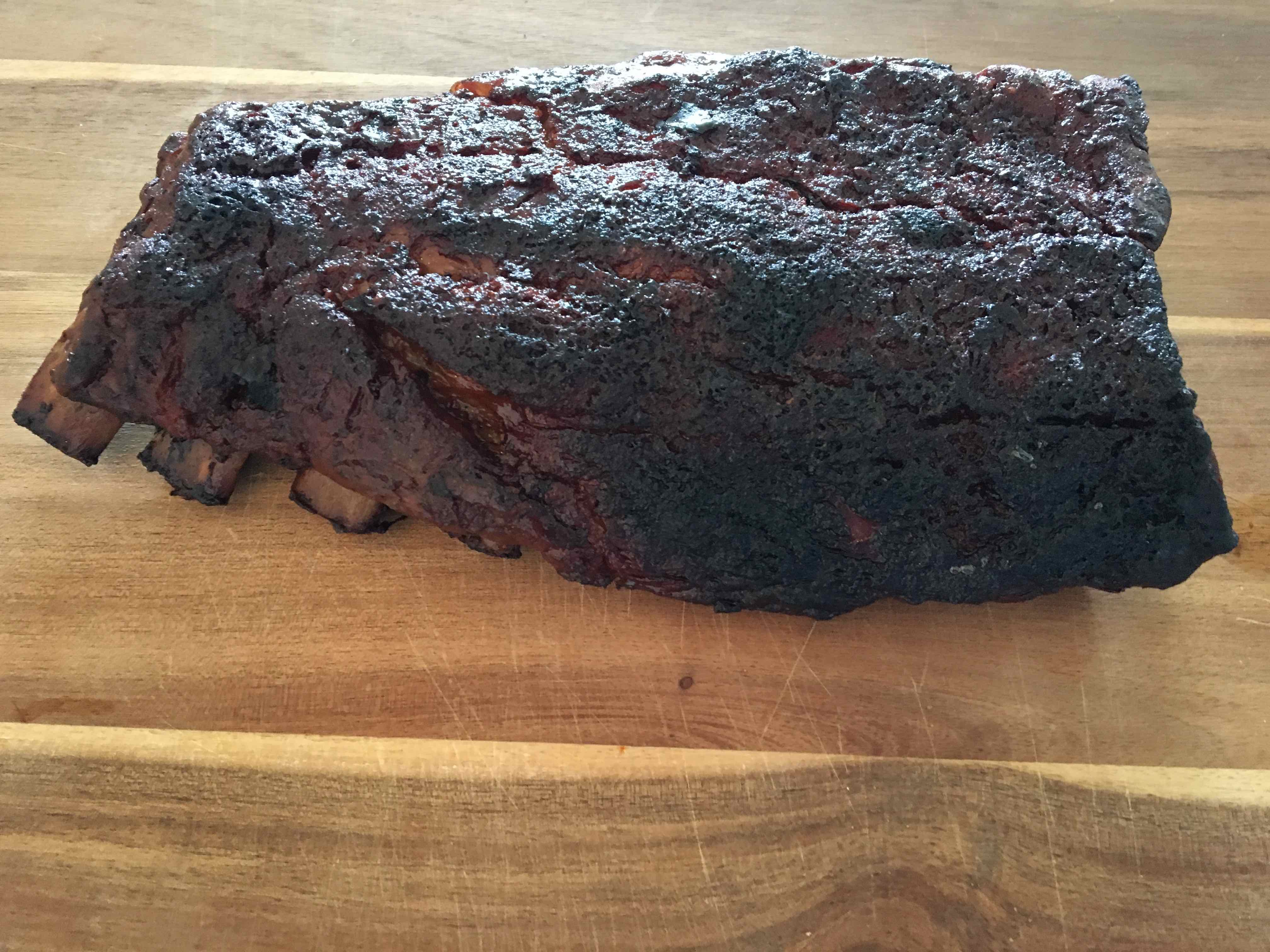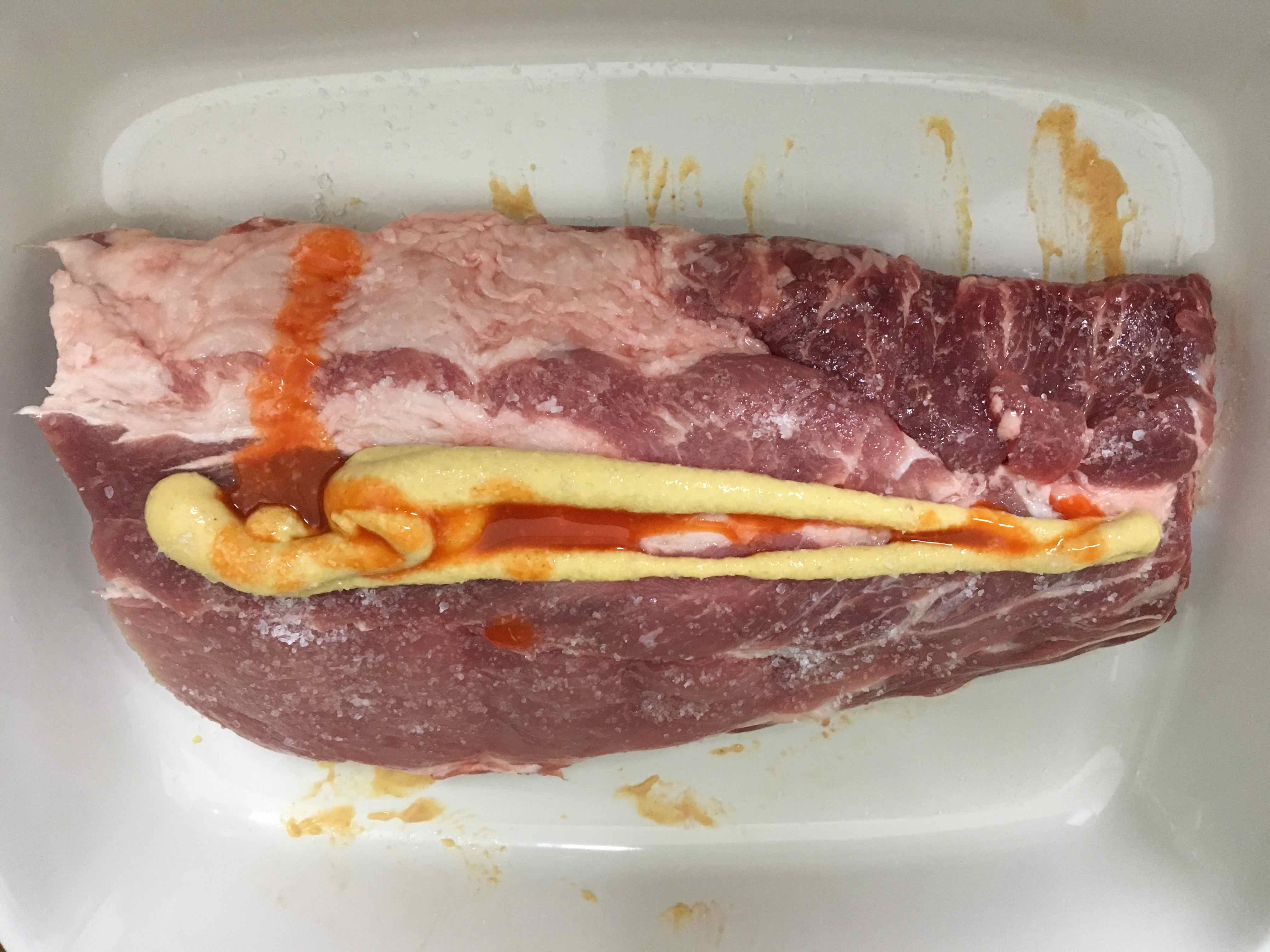 Limpiamos el costillar de grasa y si tiene membrana en el lado de los huesos se la quitamos. Lo salamos y embadurnamos por todos los lados con abundante mostaza y tabasco al gusto. Lo ponemos con los huesos hacia abajo en una fuente y lo cubrimos pro encima con las especias previamente mezcladas. Lo dejamos marinar al menos una hora fuera de la nevera o mejor toda la noche en la nevera y lo sacamos una hora antes de cocinarlo.