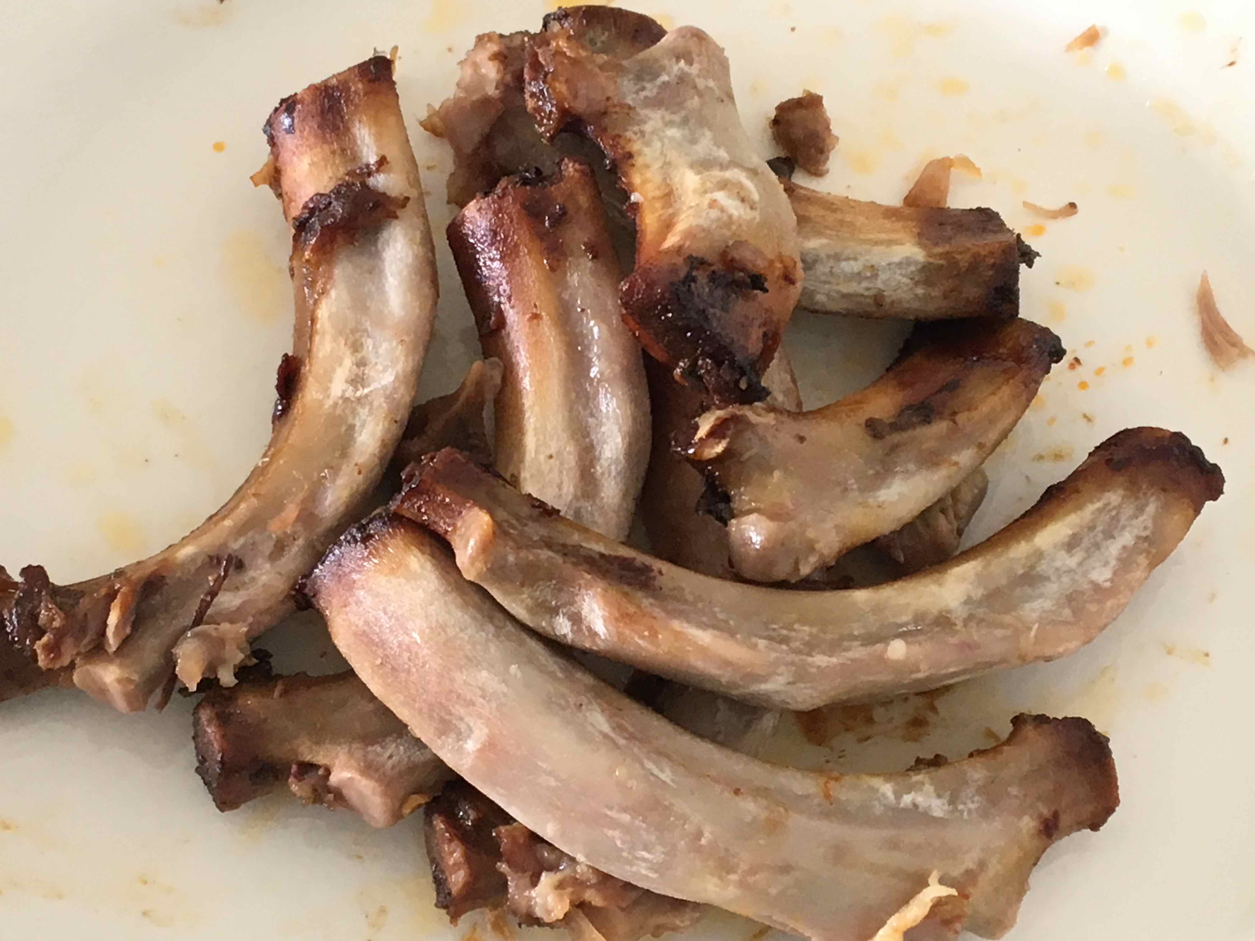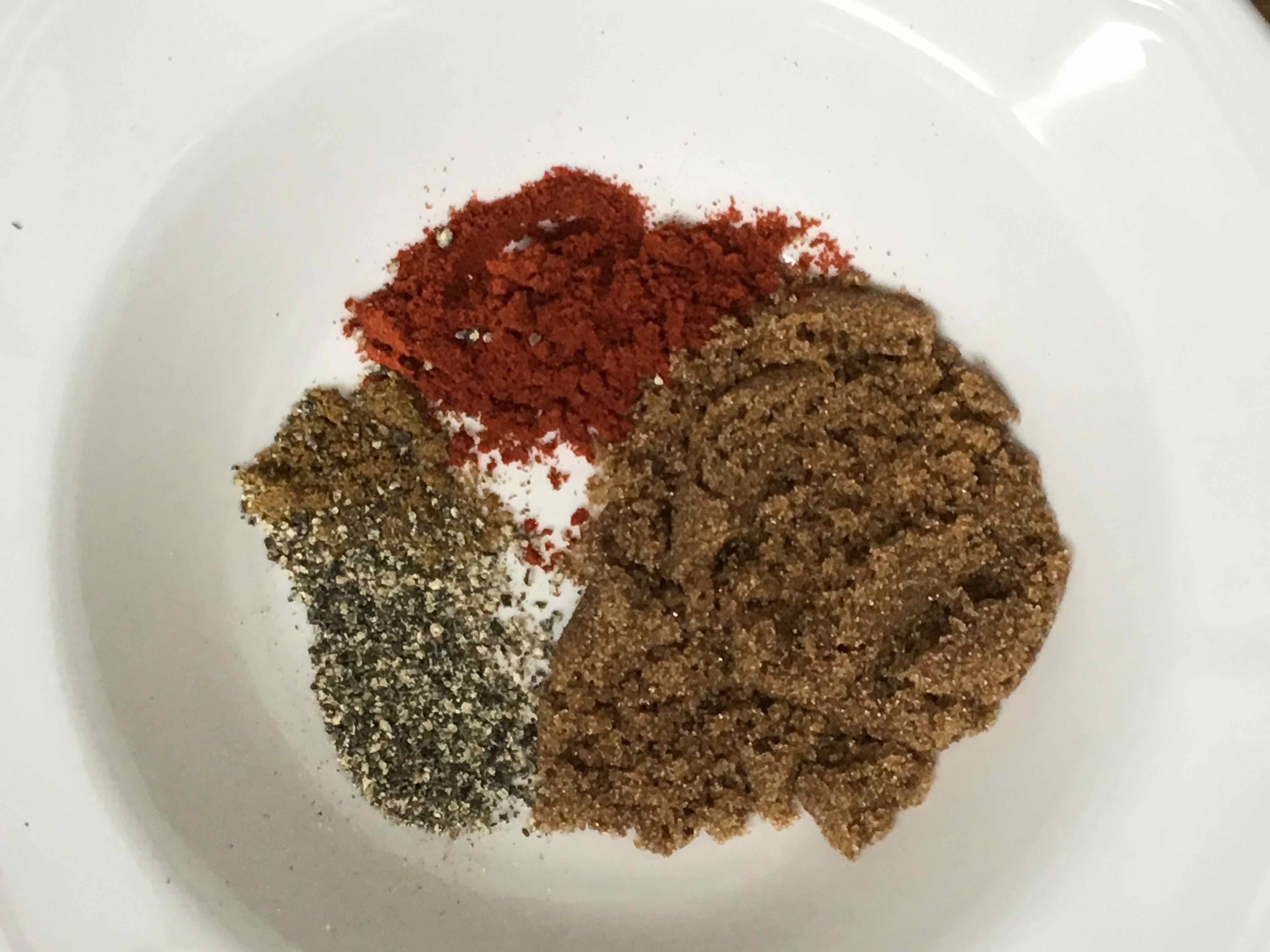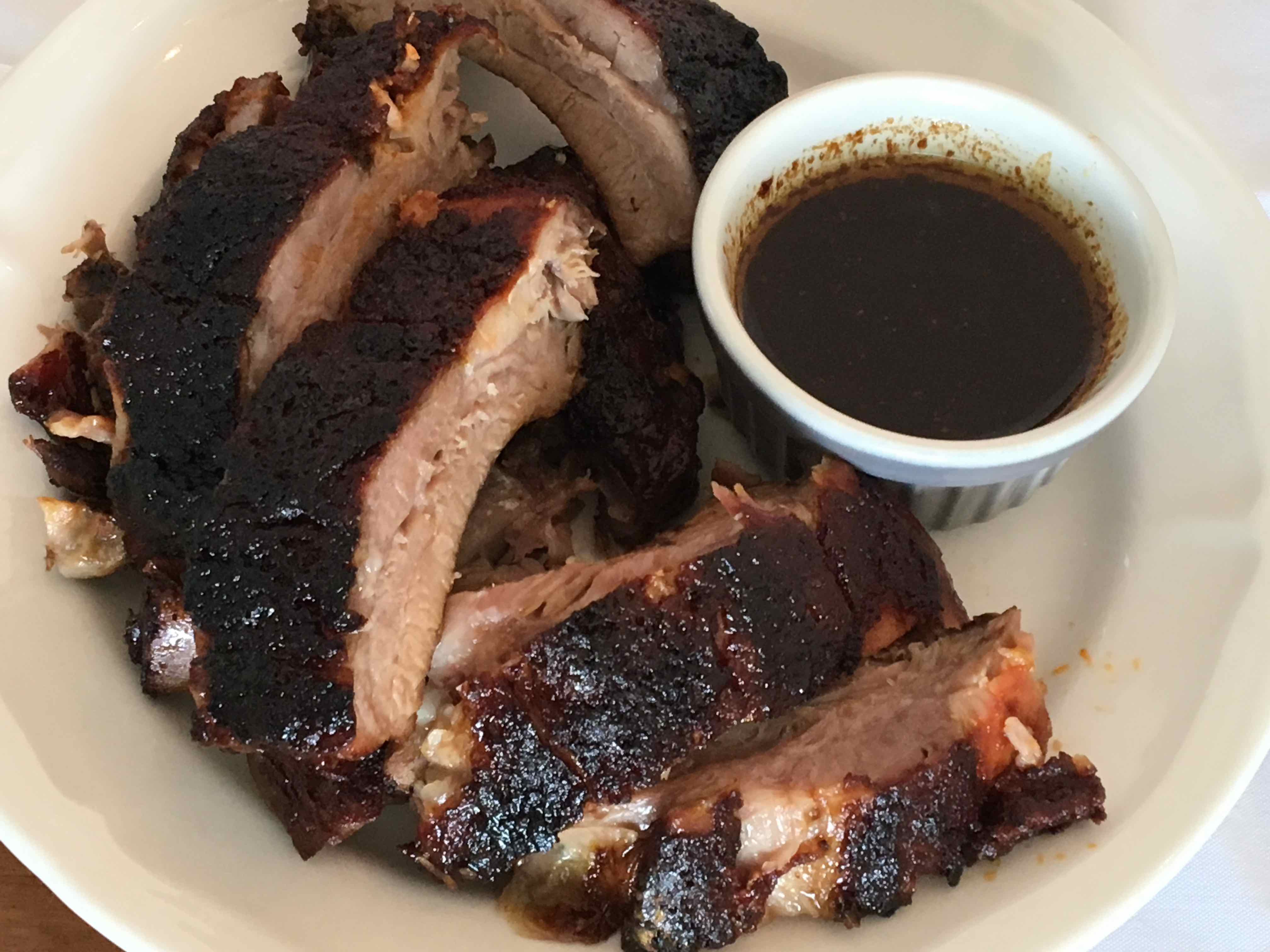 Limpiamos el costillar de grasa y si tiene membrana en el lado de los huesos se la quitamos. Lo salamos y embadurnamos por todos los lados con abundante mostaza y tabasco al gusto. Lo ponemos con los huesos hacia abajo en una fuente y lo cubrimos pro encima con las especias previamente mezcladas. Lo dejamos marinar al menos una hora fuera de la nevera o mejor toda la noche en la nevera y lo sacamos una hora antes de cocinarlo.