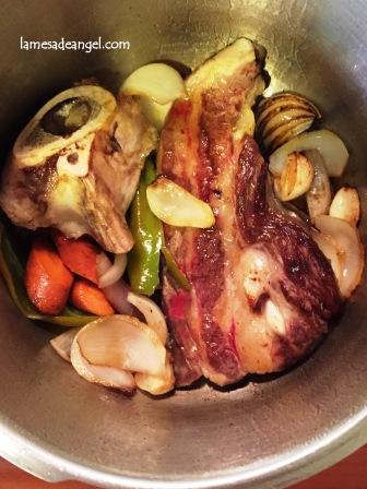 Cortamos las verduras en trozos grandes. Las distribuimos junto con los huesos y la carne en la bandeja de horno. Horneamos hasta que se tuesten las verduras. Si queremos un caldo oscuro las tostamos más (casi quemadas). En la olla doramos mucho la carne y los huesos con un poco de aceite. Los reservamos y doramos las verduras a fuego fuerte. Igual que con el horno cuanto más doradas más oscuro el caldo, pero con cuidado de no quemarlas para que no amargue. En los dos casos desglasamos con el vino y dejamos que evapore el alcohol. Ponemos todo en la olla y cubrimos con agua. Salpimentamos y cocemos 45 minutos. Colamos el caldo y enfriamos en la nevera para que se solidifique la grasa y sea más fácil retirarla. Las verduras se pueden batir y juntar con la carne deshilachada y sin grasa.